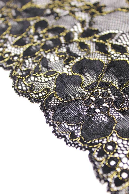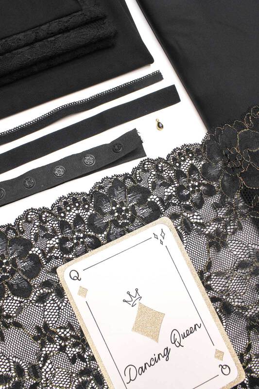 | · 2,5 m de dentelle élastique avec fil lurex · 1,40m de microfibre noir brillante et extensible dans les deux sens · Un coupon de jersey 100% coton pour l'entrejambe · 2m d'élastique culotte de 0,7cm de large pour les cuisses · 2m d'élastique sous-poitrine 1,3cm de large pour la brassière intégrée · 20cm de bande boutons pressions pour l'entrejambe · 2 coupons de dentelle et tulle extensibles supplémentaires, que tu peux utiliser pour couper les décolletés et manches de ta toile · 1 bijou goutte d'eau doré inoxydable |